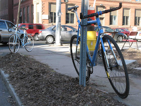 At the next signpost (can we get a bike rack here already?), I saw another blue single speed, this time a fixed-gear Schwinn Madison. I know of at least two blue Madisons in Hartford, but this is the only one with facial hair. This mustachioed brakeless fixie has more of a rough-and ready look about it. This bike has definitely accumulated some miles, and I mean that in a good way. Perhaps the third graders in my neighborhood would call this a "Ridden-ass bike" though that phrase lacks the smooth phonetic flow of the other compliment. The cow horn handlebars look like a home-brewed drop bar chop & flop, based on the inverted Bontrager logo. DIY FTW!I briefly met and chatted with the bikes' owners inside the coffee shop and was having a good conversation when I was recruited by La Paloma's owner to help unload a new refrigerator. As I showed my commitment to supporting my favorite local haunt and eating unspoiled food, the young pair left to continue riding and enjoying the beautiful weather, and really, who could blame them? It has been awfully nice outside these past few days.