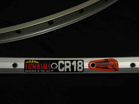 The choice of a pair of Sun CR18s as my new rims was an easy one. They have a great reputation, can be found online for short money and they are approved for touring and tandems. Mine were found at a discount for cosmetic reasons- slightly flawed anodizing on the braking surface is barely noticeable and will disappear as I ride the bike anyway. These rims should be more than sturdy enough for my planned trip and all subsequent flogging.The original hubs are nothing special. It would make more sense and be more cost-effective to toss the wheels altogether and find a decent replacement set on sale, but that wouldn't be in keeping with my original goals to save as much of Dad's original bike as I could and learn new skills through this project. A "Joytech 95D" loose-ball bearing hub up front and a Shimano Acera cassette hub out back have gotten the job done for over 15 years now. I've been pretty good about cleaning and repacking the ball bearings over the years, so a new set of bearings should make them once again good-as-new.