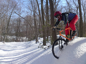 As a reprise to Wednesday's snow escapades, we met up with another famous Glastonbury mountain biker, Al, headed to the part of the Meshomasic on the eastern part of rt. 2 and its gas line. It was warmer and the sun was shining, we busted through the snow more. But, there were still awesome moments of riding on mogul-type stuff. It makes mountain biking a lot more like skateboarding or BMX or maybe surfing. Instead of riding for an hour without putting a foot down or pausing, it's ride for two minutes, punch through the snow, pull your bike out and try to go some more. Salem had a particular intense crash and broke his seatpost. The next two days don't look great for this type of riding because it's supposed to be warm.