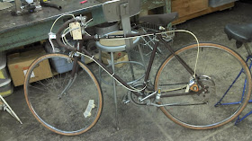 Back in Urbana, IL, I caught up with Joel at The Bike Project and put some time in on one of the oddest bikes I've come across.  This so-heavy steel rig from White Auto Inc was outfitted with some truly obscure Shimano components.  A rear disc brake was mounted by way of a self tapping screw.  The Shimano Positron shifter and rear derailleur were actuated by two cables - and indexed.  If it weren't for the inherent shitty quality of the rig, I might have adopted it.  The rear wheel had a radial hop of 1/4" and the front fork was misaligned, and I expect both were that way when the bike was new.  It served it's purpose as a loaner bike for a couple days, and was put back into TBP circulation.