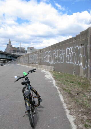 My irritation with how inaccessible this awesome path is continues. The elevators to the elevated plaza were marked "closed for season." It's April, sunny, and warm. What season are they waiting for? So, I have to either go all the way around from the edges of the Riverfront path (which I do) or I have to portage my bicycle up all the friggin steps. I can't walk up half the stairs without getting winded. Those are crap options.