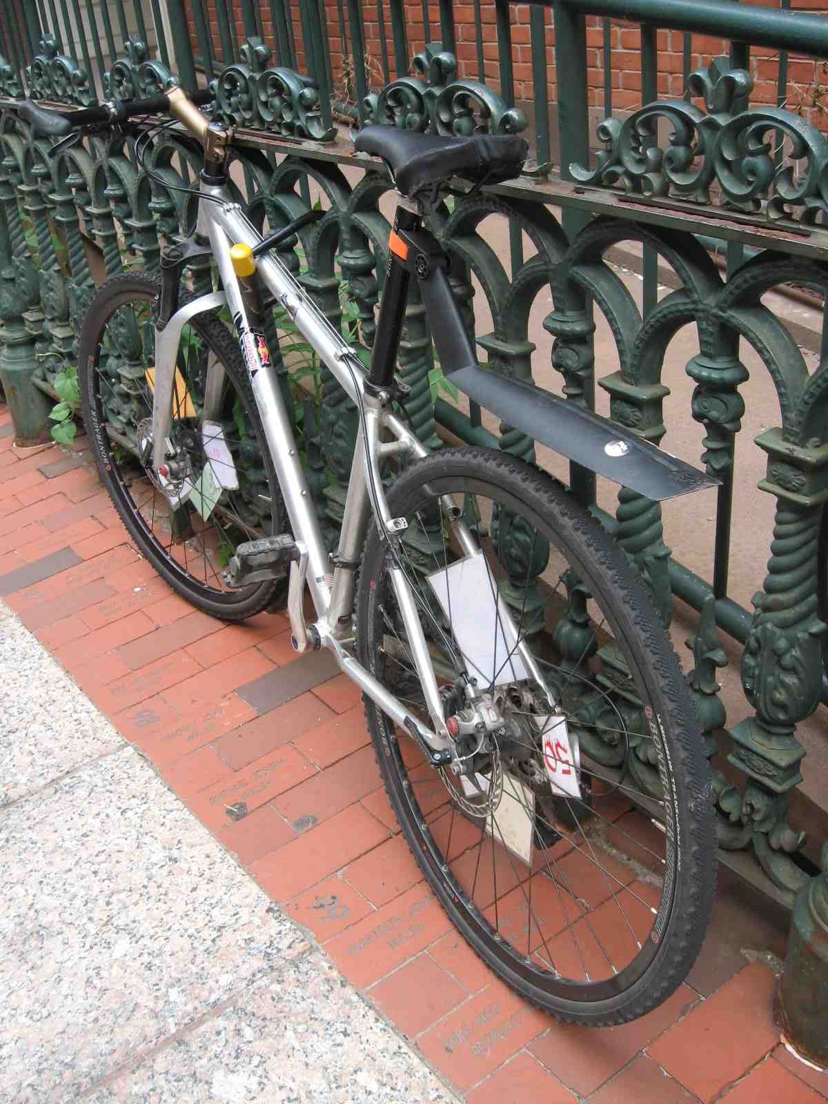 I've seen this hardtail on Pratt Street dozens of times. It's one of the regulars at the ornate iron fence in front of the late, lamented Tanuki Japanese Noodle Kitchen. It's still not a proper bike rack, mind you, but it is one of the prettiest improvised bike racks in town.