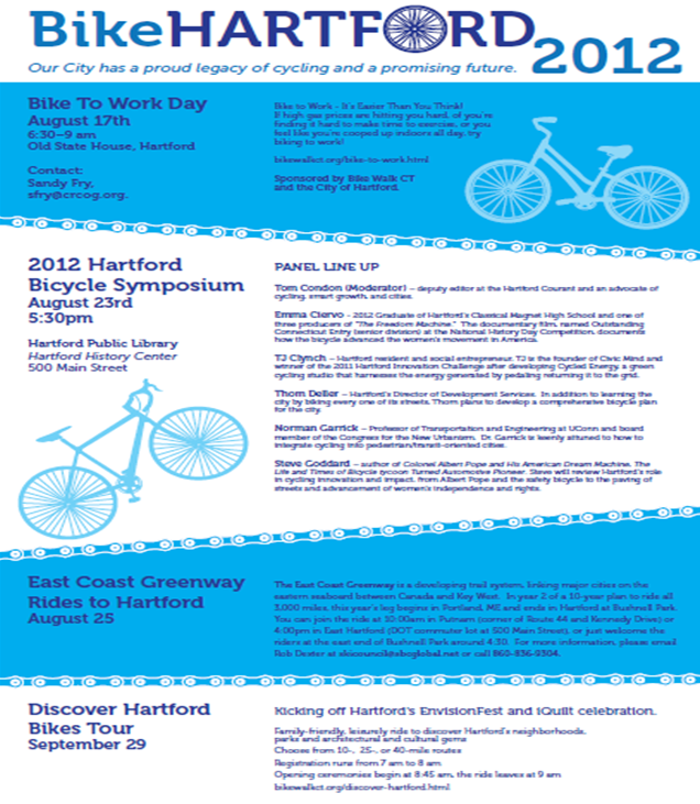 - Thursday, August 23rd - Hartford Bicycle Symposium. Meet at the Hartford Public Library at 5:30PM, in the Hartford History Center. Panelists include Tom Condon (renowned Courant editor) and TJ Clynch (Cycled Energy on Pratt Street). Get out and learn about Hartford’s bicycling history (Colonel Pope) and be a part of our cycling future.